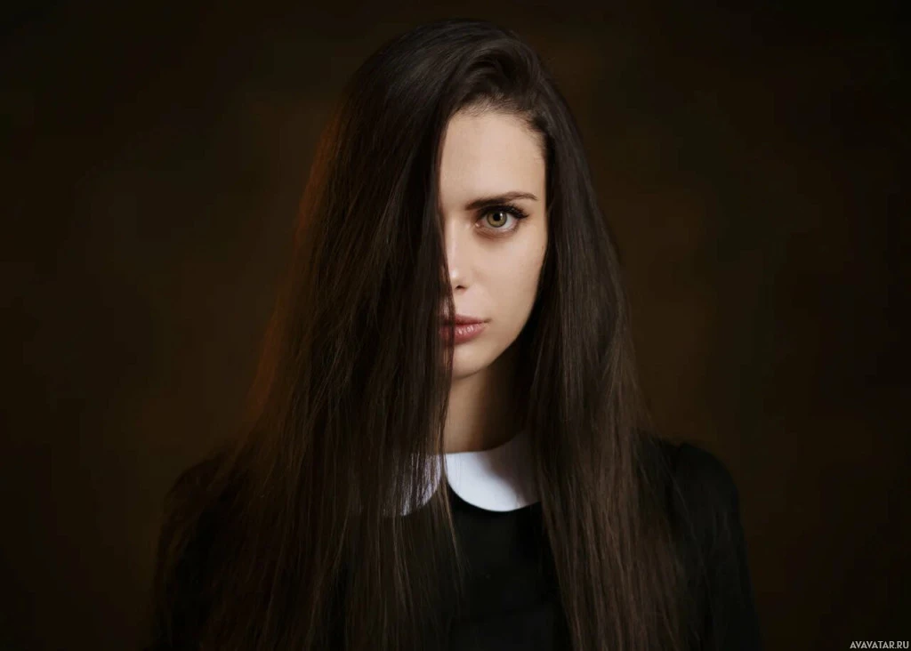 a dramatic effect by highlighting one side of her face more than the other, giving it a three-dimensional look. The overall mood of the picture is quite intense and moody.
