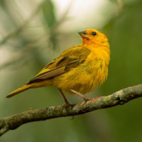 Картинка показывает ярко окрашенную птицу, сидящую на том, что кажется ветвью или стеблем на открытом воздухе с зеленью вокруг. Птица имеет желтые перья и смотрит вверх к небу, возможно, зовя или наблюдая что-то сверху.