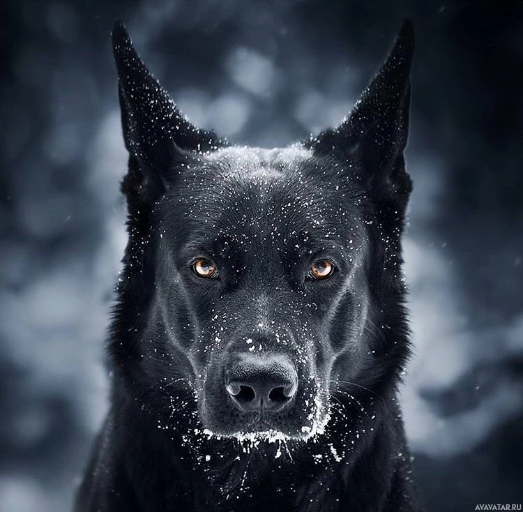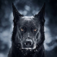 dark fur and prominent ears. There is snow visible around the dog's face, suggesting it might be