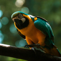 an outdoor setting, possibly within a nature reserve or aviary, given the presence of trees and the natural lighting. The parrot has colorful plumage with