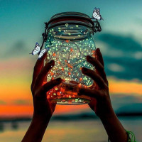 glass jar. Inside the jar, there are two butterflies perched on what appears to be glitter or star-shaped elements that add a decorative effect. The background has