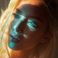 a light source, as indicated by the shadows on her face and neck. Her eyes are squinted, which could be due to the brightness of the light source or the sun. The coloring in the image suggests it may have been edited or filtered for a specific effect, giving it a somewhat
