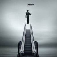 a sense of solitude or introspection amidst the everyday activity of using escalators in public spaces.