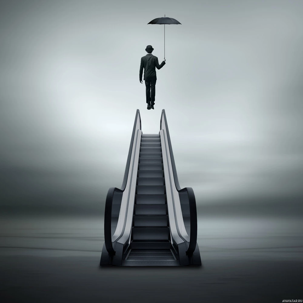 escalator steps while holding an umbrella. The individual appears to be wearing