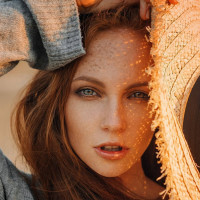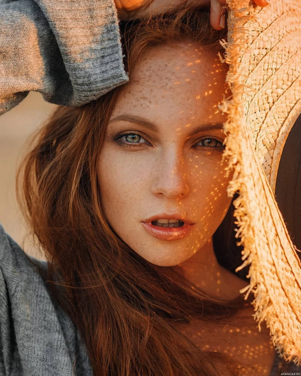 a straw hat with a yellowish hue, which suggests the photo might have been taken during sunset or in warm weather, given the soft glow and shadows on her face. The background is out of focus but appears to be