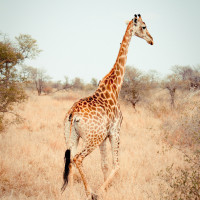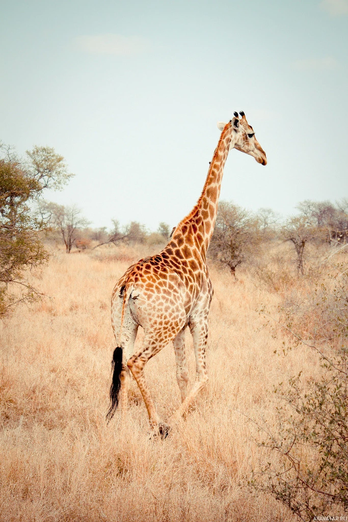 a giraffe in the wild. It appears to be standing on a dry, grassy plain with