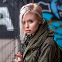an urban environment, possibly a street or alley. The style of clothing and her haircut give a modern and somewhat edgy vibe.