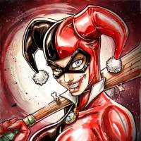 iconic costume, which consists of a red and black jester suit with white accents, including the fringes on her sleeves, the ruffle around her neckline, and the white diamond pattern on her chest. Harley Quinn is also known for carrying large mallets or batarangs, which she holds in each hand here. Her hair is styled into