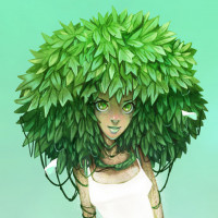 The image depicts a fantasy-themed character who appears to be a dryad, which is a type of spirit in mythology that resides within trees. This character has an abundance of greenery and leaves on her head, representing
