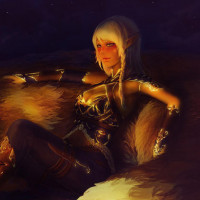 white hair and is wearing some sort of armor or clothing that could suggest a role related to combat or adventure. They are both positioned near a small fire that provides warmth and light, enhancing