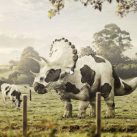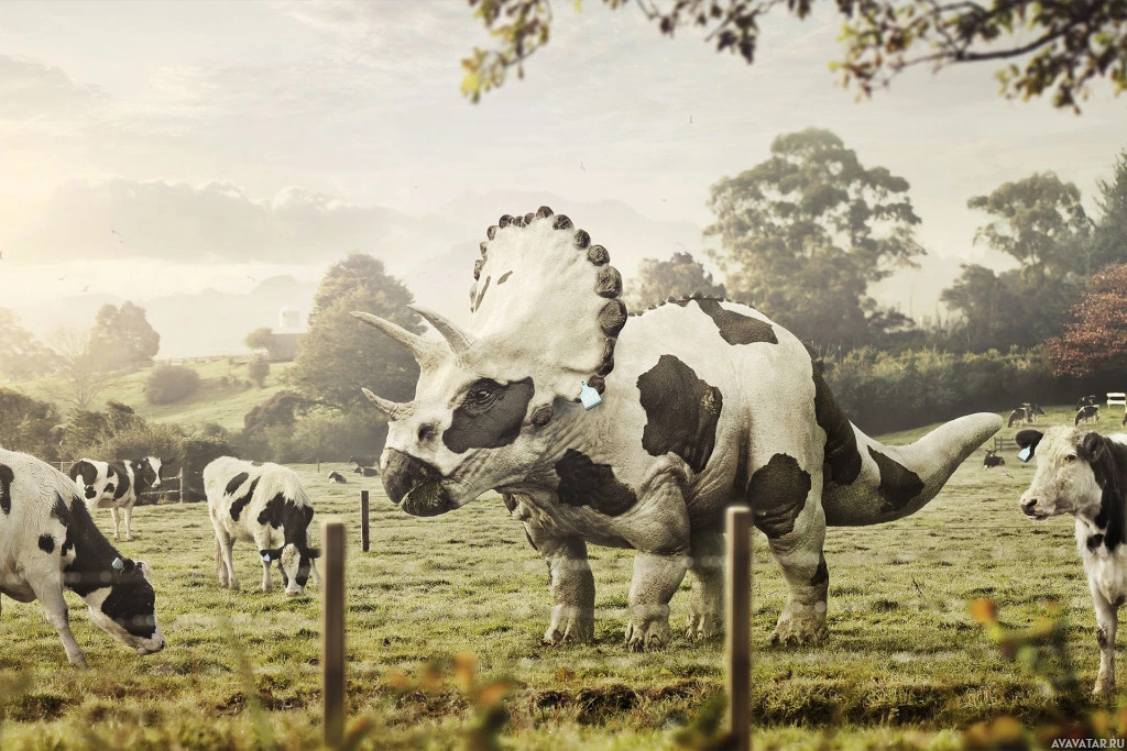 The picture shows a scene with an animal that is a mix between a cow and a dinosaur. This creature appears to have the body of a cow, including spots like a typical Holstein cow, but its head and neck resemble those of a sauropod dinosaur, which is often associated with