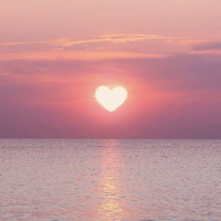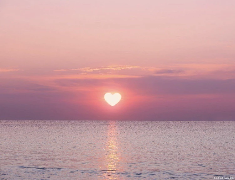 a heart shape. This is likely due to the angle of observation and the clouds or haze in the sky creating a silhouette that resembles a heart. It's a serene and picturesque scene, possibly at a beach or