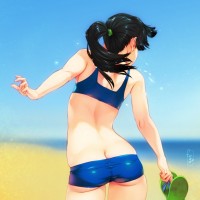 a girl on the beach. She is from behind and appears to be wearing a blue