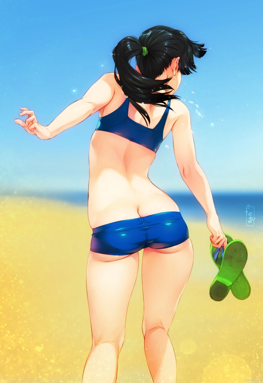 bikini bottom, but no top is visible. Her hair is styled in a ponytail, and she seems to be enjoying her time at the beach. The sun is shining brightly, suggesting it's daytime. There are sandals by her feet, which indicates she may have been walking on the beach or near the water.