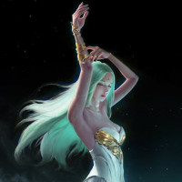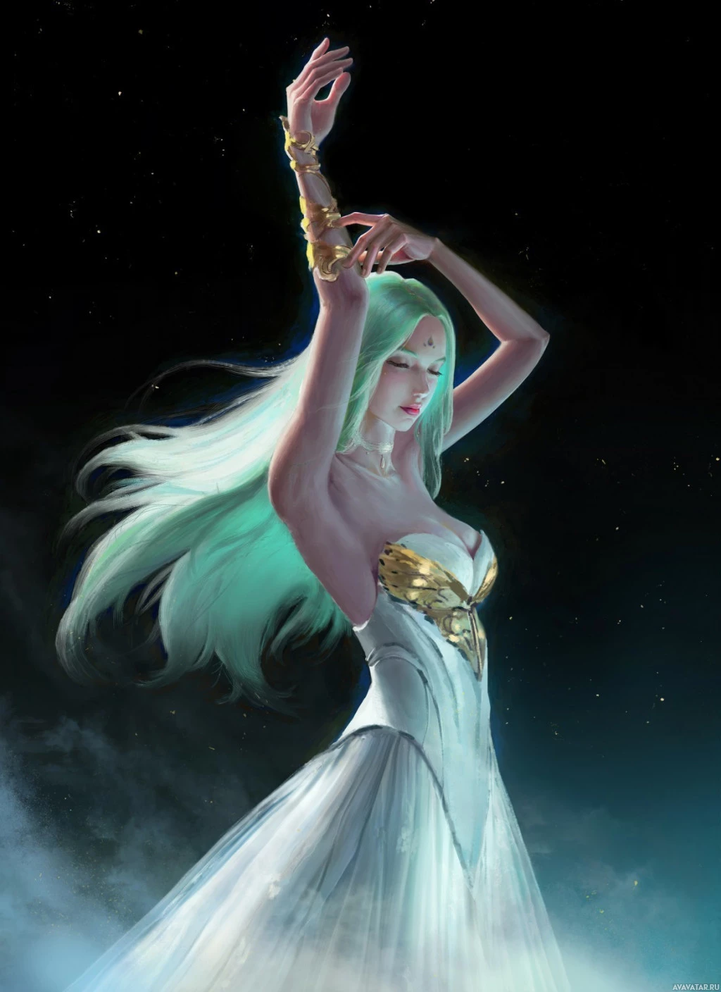a female character with turquoise hair. She is adorned in a fantasy-inspired outfit that includes a dress and possibly armor, suggesting a magical or mythical theme. The character has her hands raised, possibly in