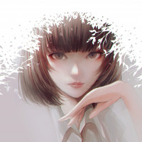 a shirt with a collar, and her hand is gently resting on a flurry of what looks like snow or flower petals. The overall mood of the image is soft and serene.