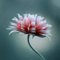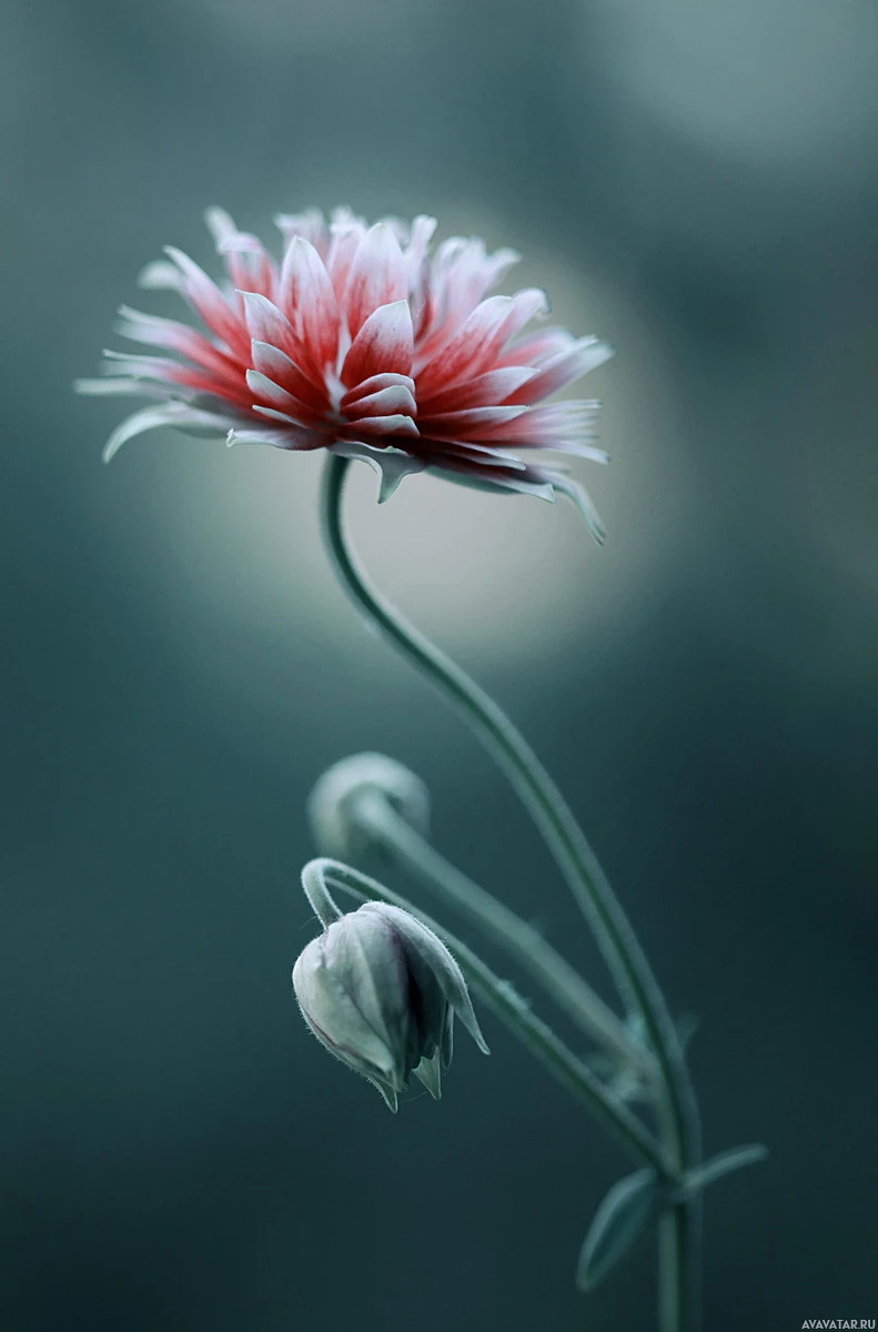На этой картине изображен один розовый цветок, возможно, далия или маригольд, с видимыми лепестками и небольшой бутон рядом с ним. Фон кажется размытым, но может предложить наружную обстановку, такую как сад или парк из-за зеленых тонов.