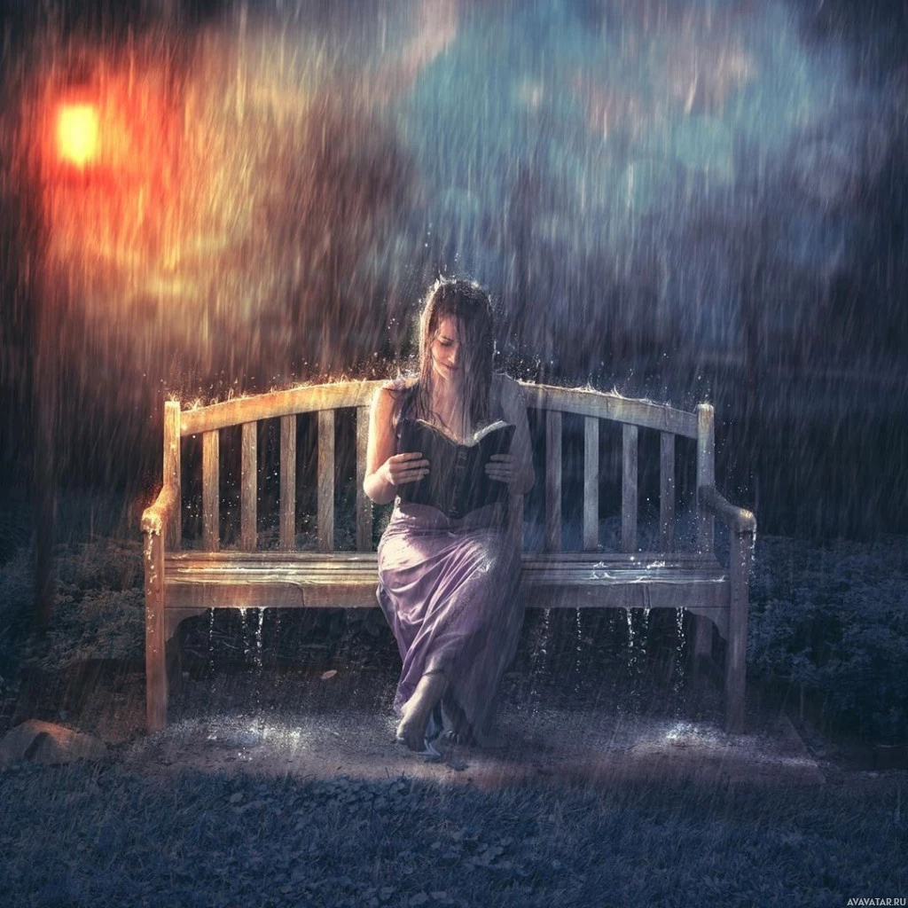 The picture shows a woman sitting on a bench reading a book. It is raining, as indicated by