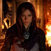 a female character wearing what appears to be armor with a hood, suggesting she may be from a fantasy or role-playing game. She is standing amidst flames and what looks like destruction, giving her an intense and heroic appearance. Her gaze is directed off to the side, and she has