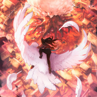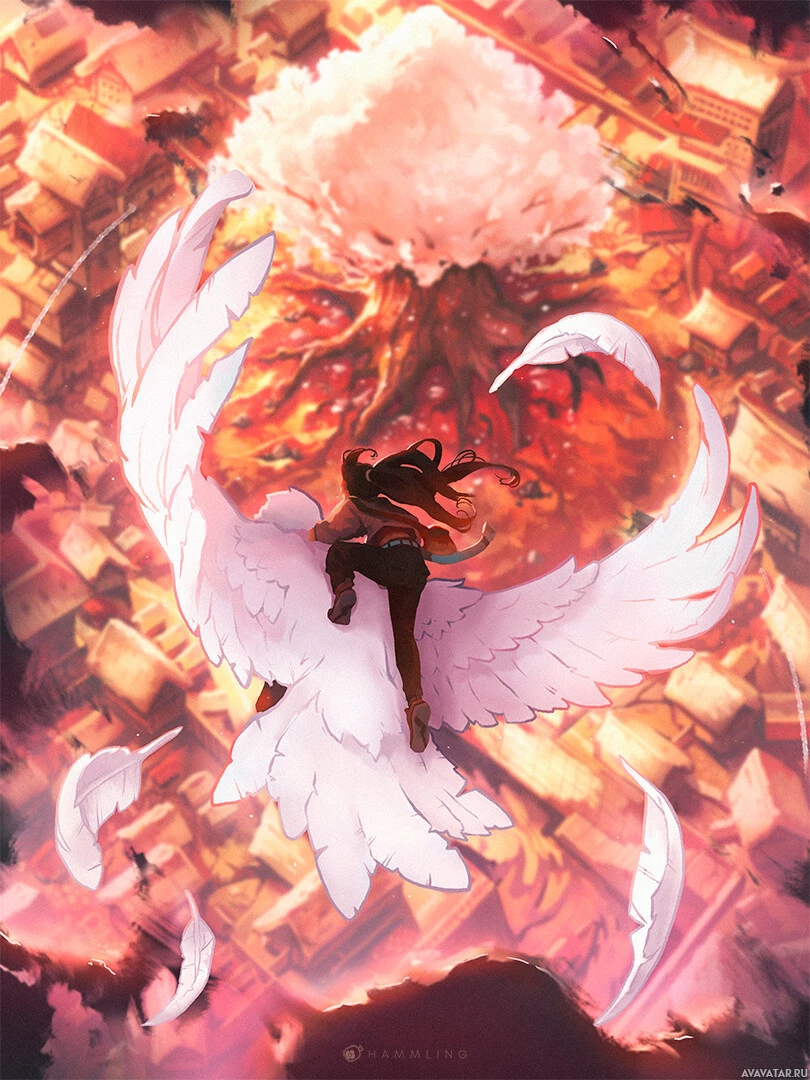 На картинке изображена иллюстрированная сцена с элементами фэнтези. Сзади изображена девушка, летящая по воздуху на спине птицы. Художественный стиль предполагает, что это может быть анимационный сериал или графический роман, а фон показывает хаотичную сцену с разрушающимися зданиями и облаками дыма, поднимающимися вверх. Общее настроение изображения — это настроение действия и, возможно, опасности, о чем свидетельствует разрушение на заднем плане.