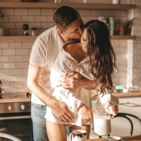 an intimate moment in what appears to be a kitchen setting. They are standing close together, with the woman leaning against the man's chest as he hugs her from behind. Their faces are close together, suggesting a romantic or loving interaction. There is food on the countertop nearby, including what looks like pastries and possibly some baked goods, indicating that this scene might be taking place in