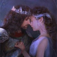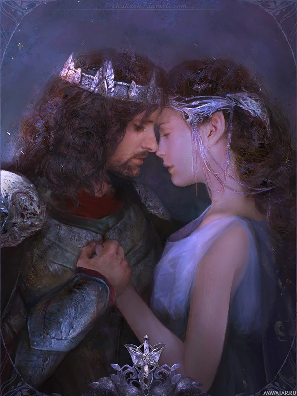 The image depicts a couple, likely portraying the characters Arwen and Aragorn from J.R.R. Tolkien's Middle-earth series. They are dressed in
