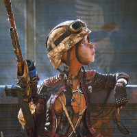 a female soldier or mercenary sitting on the back of a vehicle. She is wearing military-style attire, including