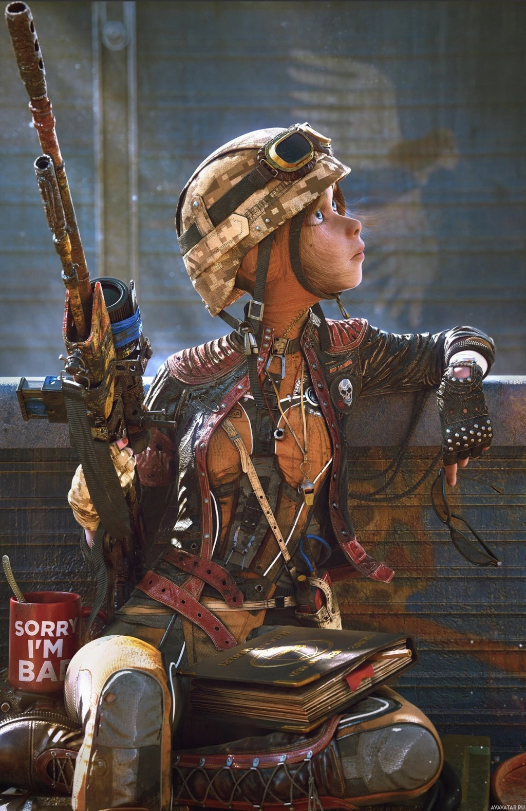 a helmet with a visor and goggles, which suggests she might be in a combat situation or training exercise. Her posture is relaxed, and she seems to be looking off into the distance. The character has an expression that could be interpreted as contemplative or bored. The image is detailed, showing elements of her armor, weapons, and personal effects, such as what appears to be a book or manual in front of her. The overall style of the artwork is realistic with high levels of detail that give