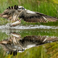 The image shows a bird, specifically an osprey, in flight with its wings outstretched. It appears to be grabbing or holding a fish in its talons while over a body of water, possibly reflecting the scene below on the surface.