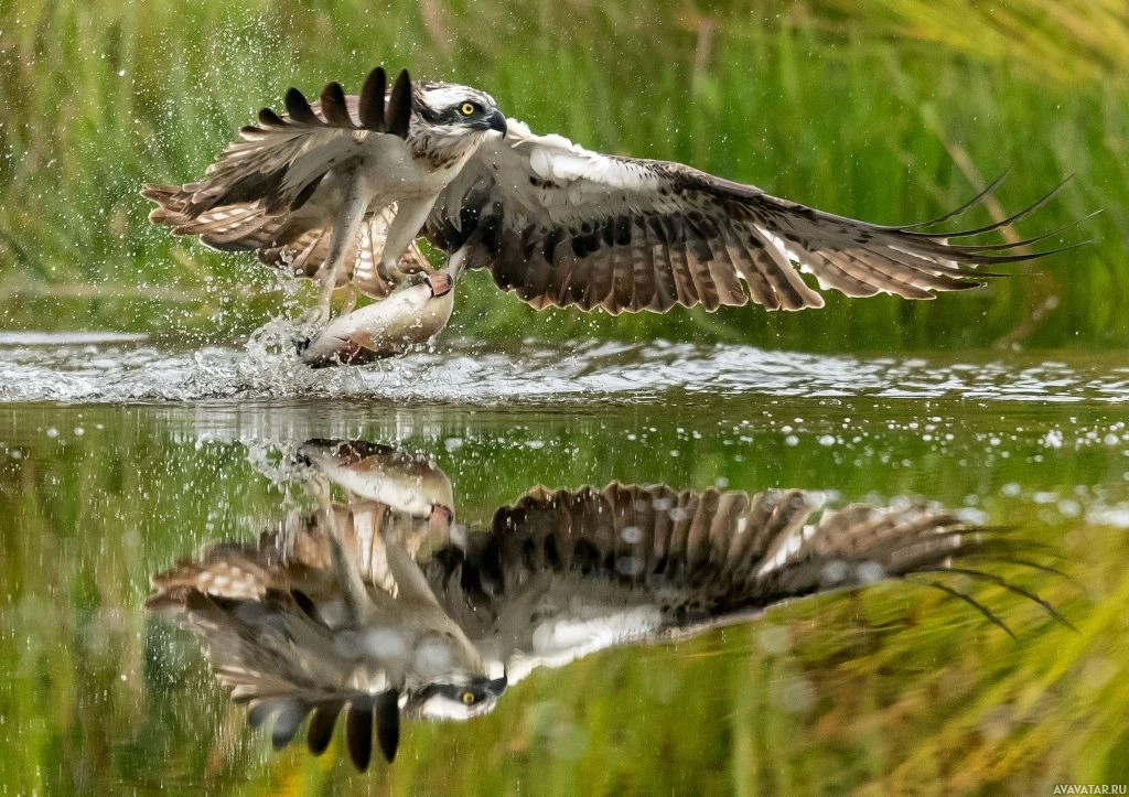 На снимке изображена птица, а именно скопа, в полете с вытянутыми крыльями. Похоже, что он захватывает или держит рыбу в своих когтях над водоемом, возможно, отражая сцену ниже на поверхности.