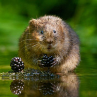 a body of water that could be a river or a pond. It appears to have caught some berries, as suggested by the presence of what looks like berries near it. The animal is looking directly at the camera with
