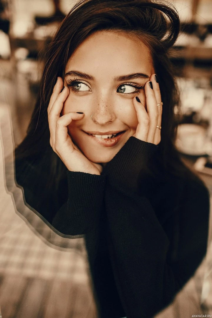 The picture features a young woman with brunette hair. She is smiling and has her hands near her face, possibly in an expression of surprise or amusement. She appears to be indoors, perhaps in a store or cafe given the background that suggests a commercial setting.