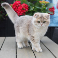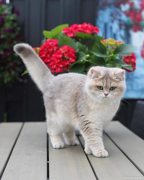 patio area. The cat's fur is fluffy, typical of a domestic