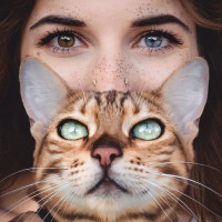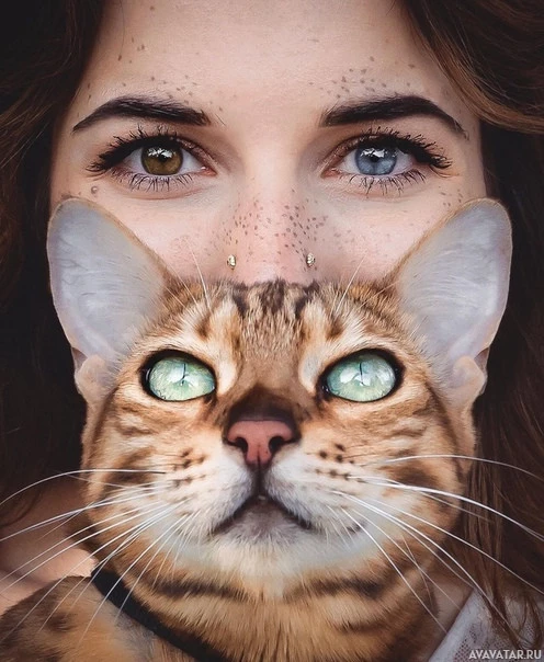 The image shows a close-up of a person and a cat. The person appears to be holding the cat in their arms, with both their faces very close together, almost touching. The cat has striking
