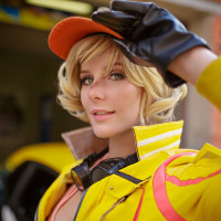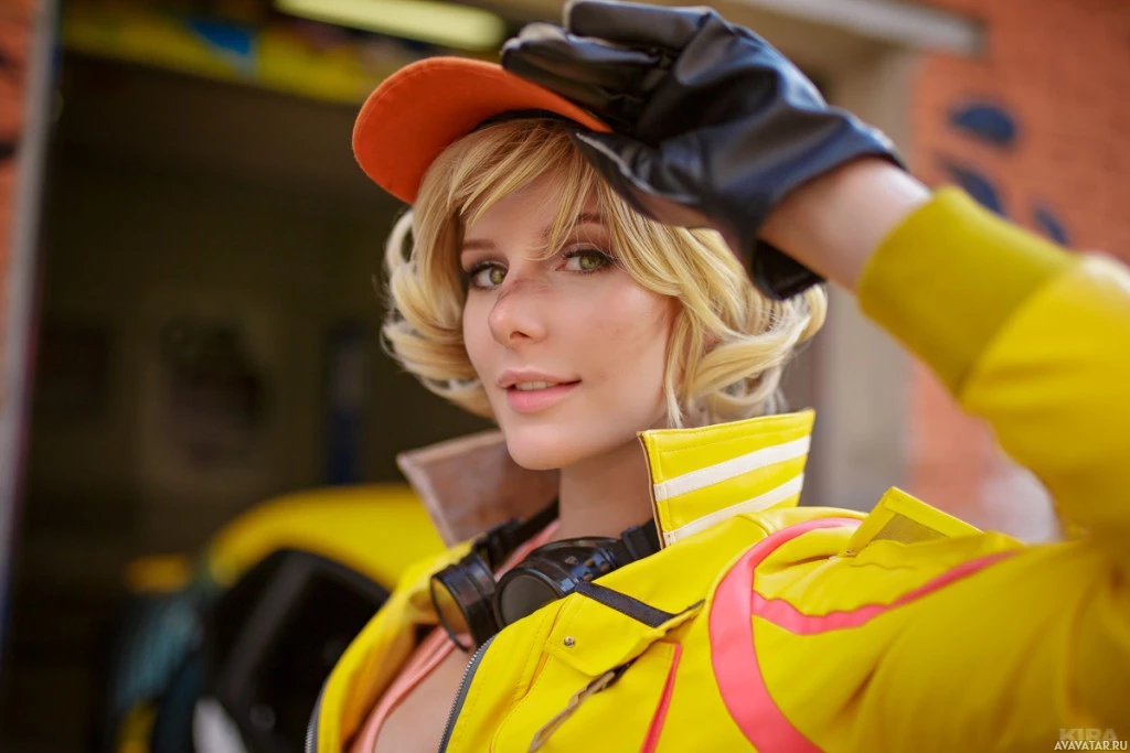 blonde hair, wearing a yellow jacket and an orange cap. She is smiling and has one hand raised as if waving or gesturing. There are various objects in the background that suggest