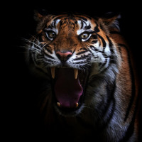 Картинка показывает крупный план взрослого тигра. Тигр, кажется, ревет или рычит, с широко открытым ртом и глазами, сосредоточенными на камере. Фон темный, обеспечивая контраст, который подчеркивает лицо и выражение тигра.