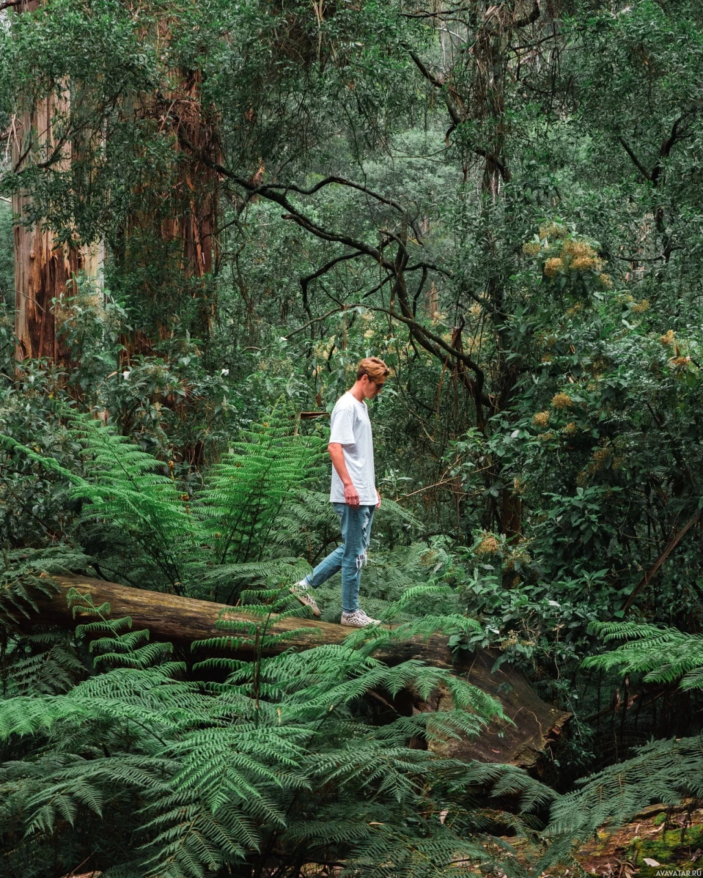 lush forest. The individual appears to be exploring the area and is surrounded by