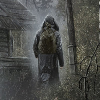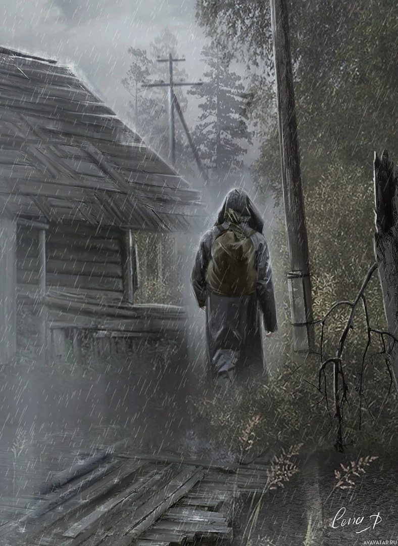 rural setting with trees and a dilapidated structure visible in the background. There's a sense of solitude or perhaps anticipation in the person's posture as they traverse through what looks like a desolate, possibly abandoned area during inclement