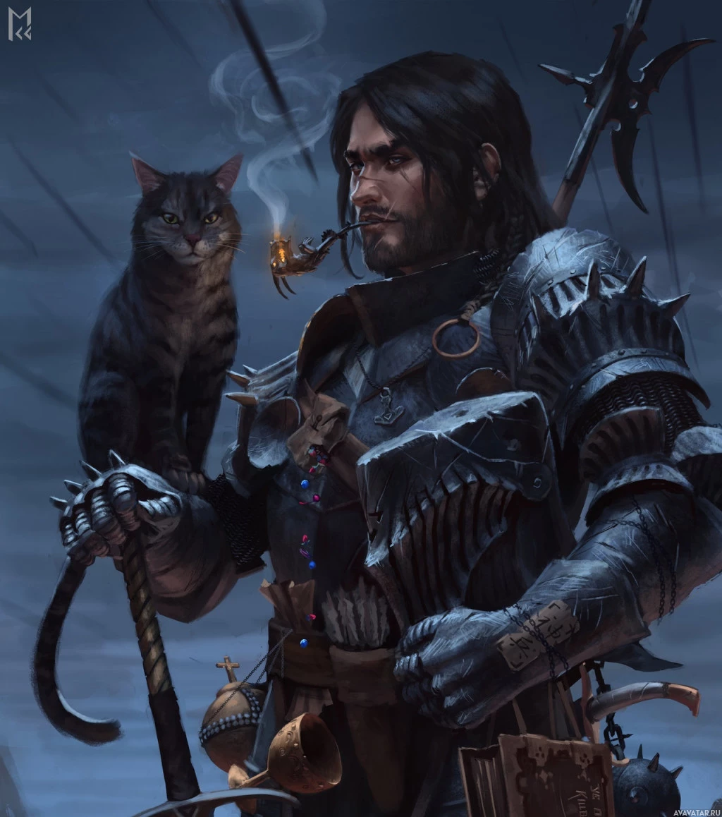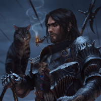 a medieval warrior or adventurer, dressed in armor and holding a staff. There's a cat on the shoulder of the character, seemingly comfortable and at ease. The background suggests