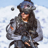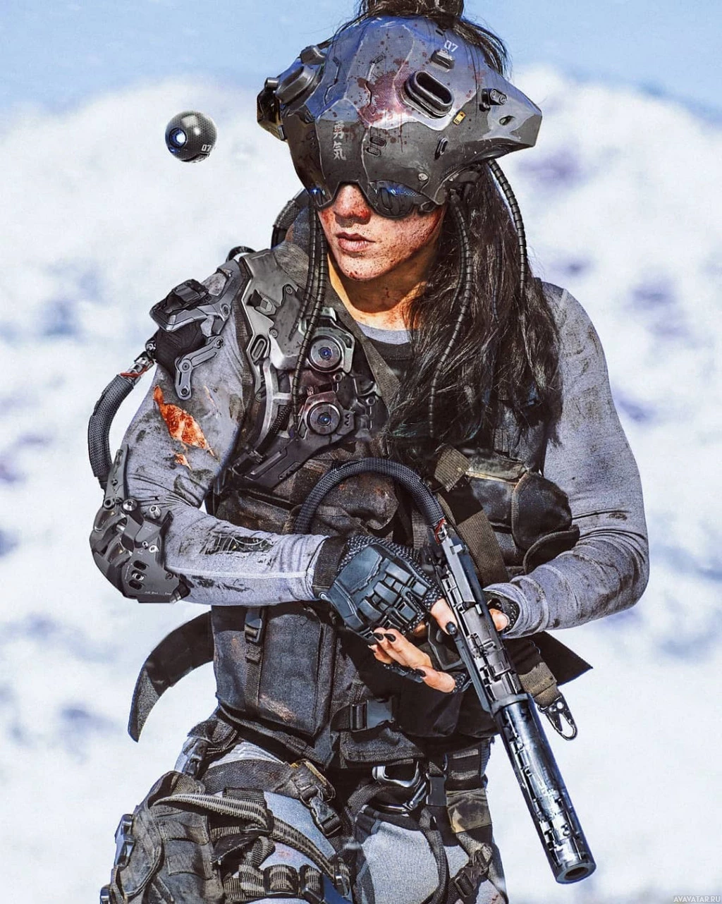 a female character who appears to be from a video game or an animated series, dressed in futuristic military gear. She is holding what seems to be a weapon and has a helmet on with a visor that covers her eyes, which could suggest she is either preparing for battle or engaged in combat. The environment around her looks like