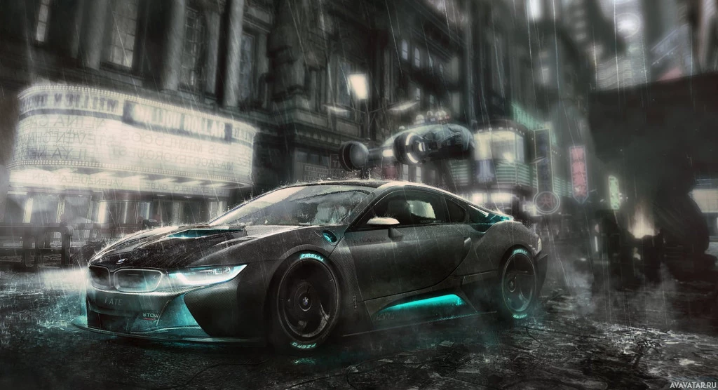 modern design, with a unique color scheme that includes shades of green and black, giving it a high-tech appearance. It's raining in the background, contributing to an atmosphere of a dystopian or