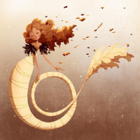 sea creature or an abstract representation of waves. The mermaid's body is covered in scales, and she is holding what looks like a leaf or perhaps a feather in her hand. Around her are falling leaves, suggesting a whimsical or magical atmosphere. The background has a textured look with hints of