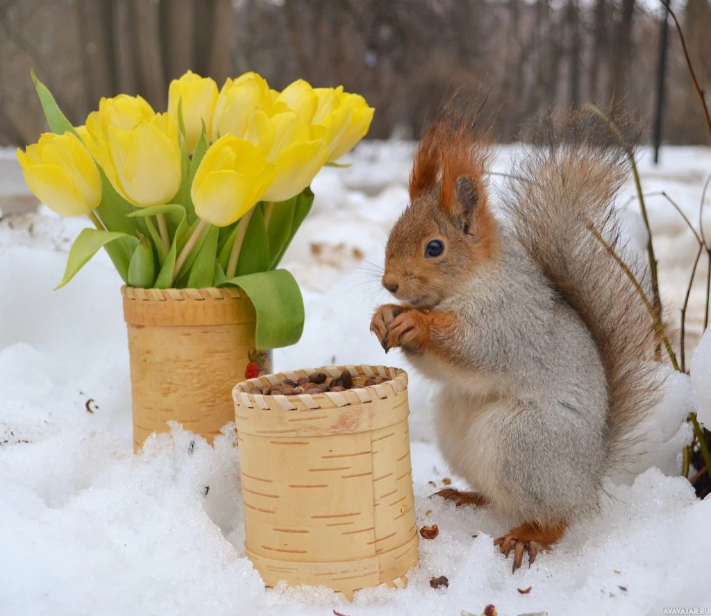 The image shows a squirrel eating nuts from a bowl placed on the ground. In front of the squirrel, there is a vase with yellow tulips, and in the background, it appears to be winter, possibly because of
