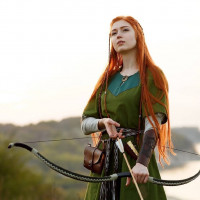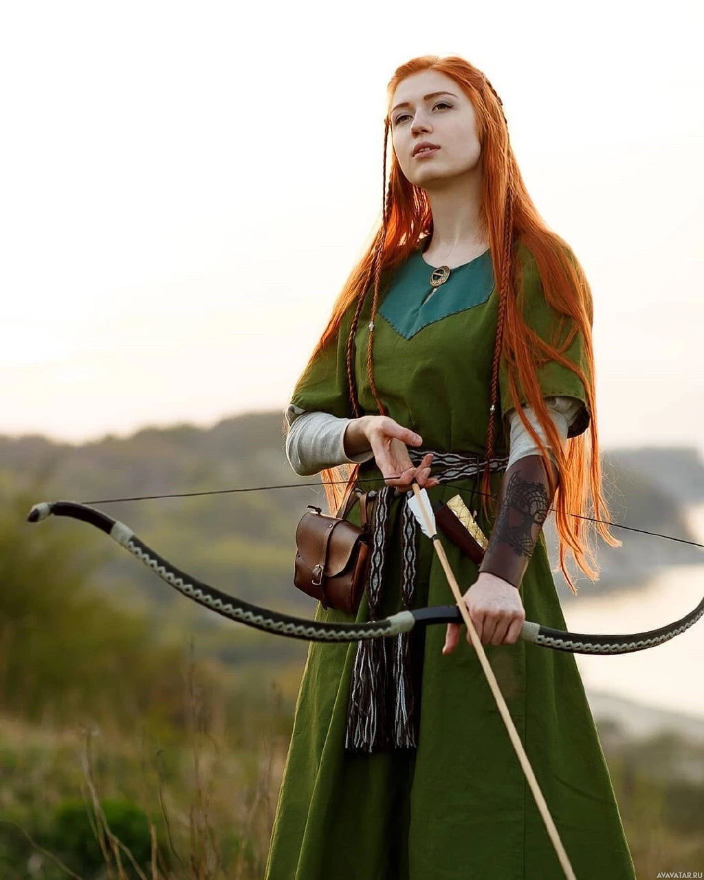The image shows a person holding a bow and arrow. She appears to be dressed in