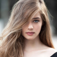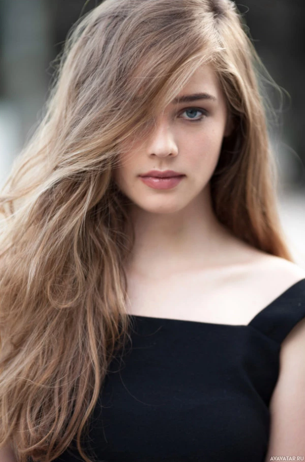 a young woman with long wavy hair and blue eyes. She has