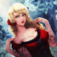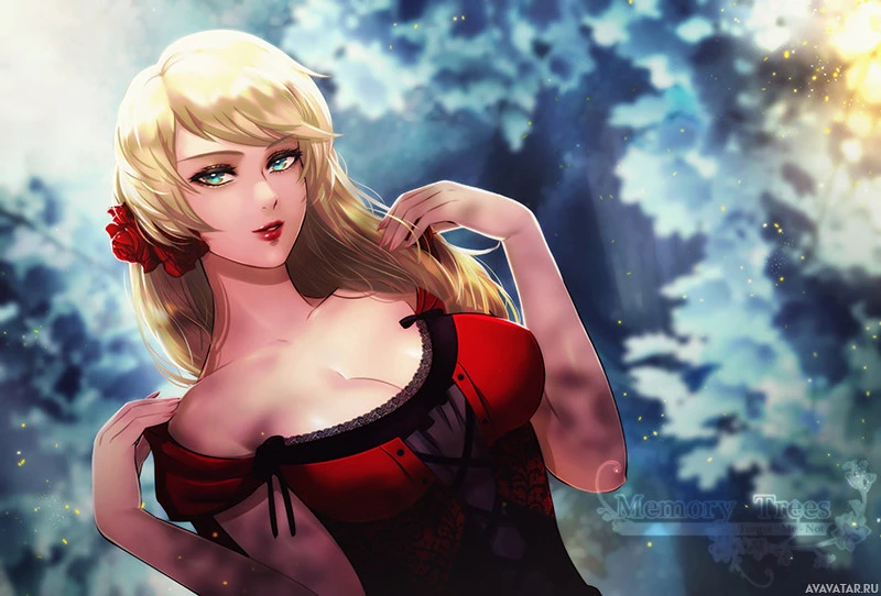 blonde hair. She is wearing a red and black dress that resembles traditional lolita-style attire, complete with ruffles and