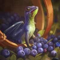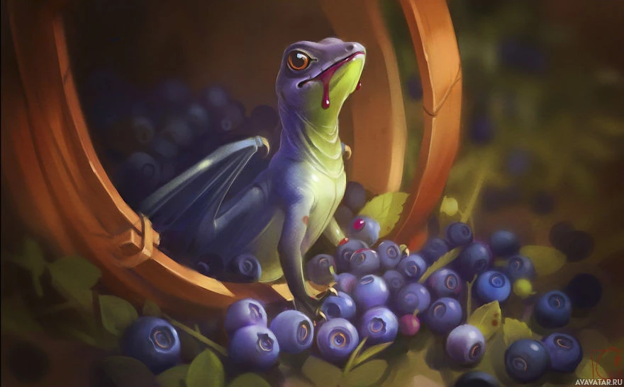 The image shows a fantasy-themed illustration of a creature resembling a frog or lizard, with characteristics often associated with dragons, such as wings and a spiky appearance. This creature is surrounded by blueberries, which are commonly known for their
