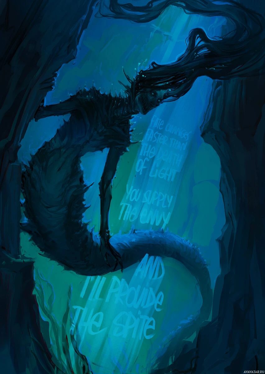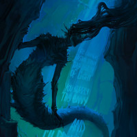 dark blues and greens, creating a moody and mysterious atmosphere.