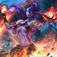 a magical outfit with fire effects and appears to be casting a spell or engaging in combat. The background suggests a forest setting that is often associated with