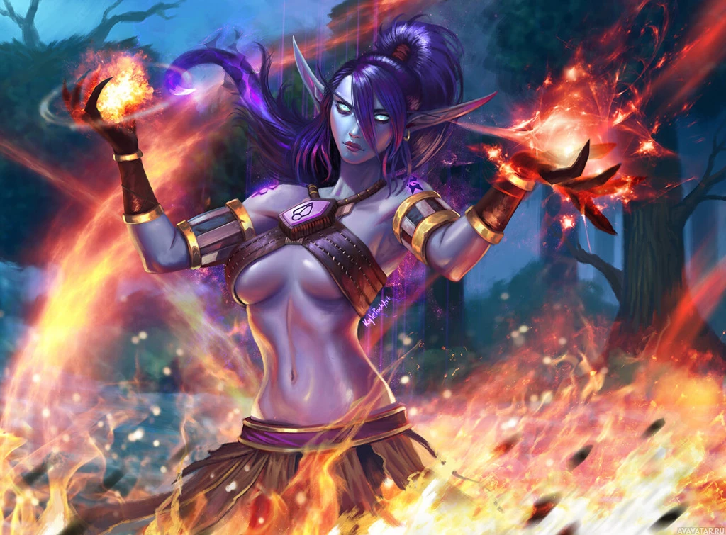 a fantasy character, likely from the game "Warcraft," known for its detailed and immersive universe. The character is a drow elf, identifiable by her slender body, pointed ears,